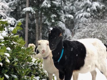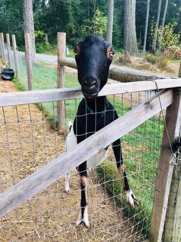 Cosmic is a majestic and gentle giant, overshadowing our does at nearly 250 lbs! He is a sweetheart and loves to get close to you for some love. He is also our only buck. If you have ever been around bucks (especially during rut), you know it is not a good idea to snuggle with them.